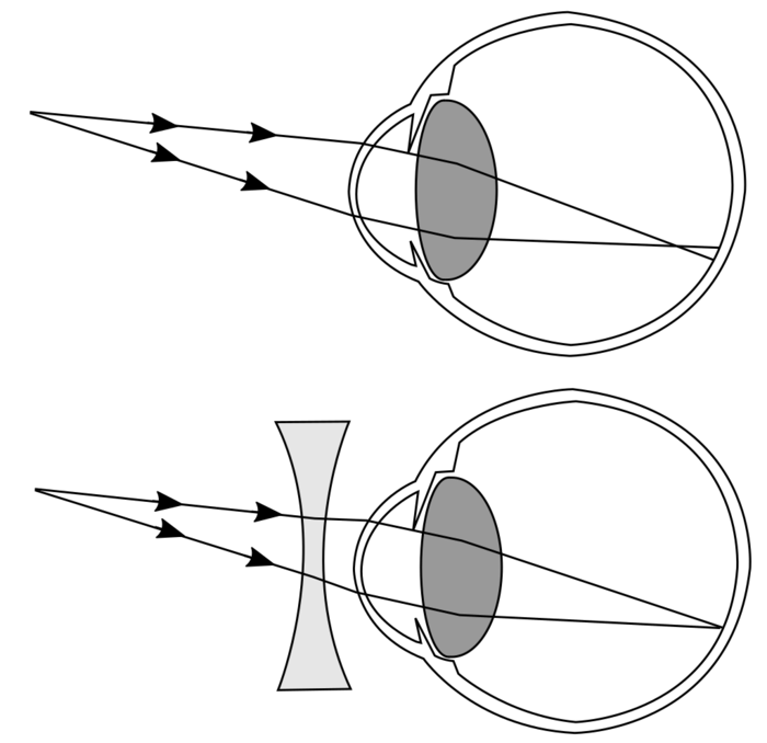 | ▲ 근시에서 광선의 경로(각각 멀리 바라볼 때, 들어오는 광선은 - 도면의 표현과 달리 - 서로 거의 평행함). 교정되지 않은 근시(위)에서는 망막 앞의 이미지 위치와 시각적 인상이 흐려진다. 선명한 이미지를 얻기 위해 발산 렌즈를 사용해 이미지의 위치를 망막 수준까지 뒤로 및 아래로 이동할 수 있다. |