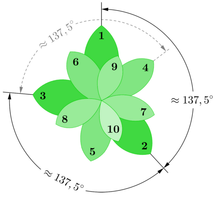 잎이 황금각을 형성하는 원리오늘날 연구자들은 "황금" 배열이 식물 발달 과정에서 공간 제약이나 옥신(Auxin)과 같은 생장 호르몬의 분포로 인해 자동으로 형성된다고 가정한다. 새로운 잎은 줄기 끝의 미분화 세포 영역에서 나온다. 이곳에서 처음 형성되는 잎은 경쟁이 없으므로 위치를 자유롭게 선택할 수 있다.