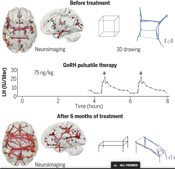 호르몬 요법의 이러한 긍정적인 효과는 기능적 자기공명단층촬영을 사용한 뇌 기능 검사에서도 볼 수 있다. GnRH 치료 후 7명의 피험자는 피질과 해마를 포함하여 사고와 기억에 중요한 일부 뇌 영역의 배선이 증가했다.
