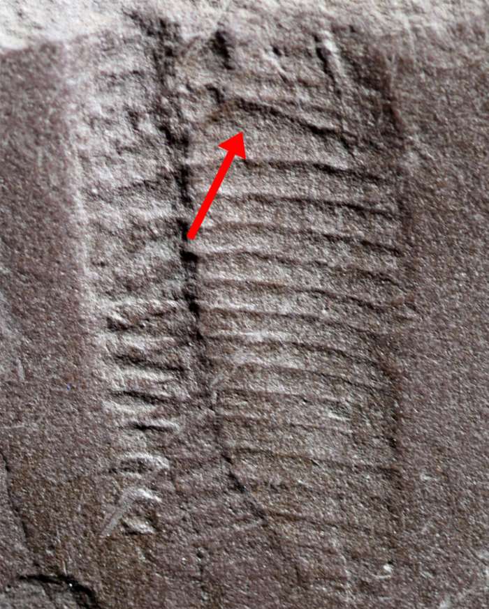 | ▲ 선사시대 파충류 꼬리 밑부분의 흔적. 화살표는 가늘고 긴 항문을 가리킨다. © Lorenzo Marchetti |