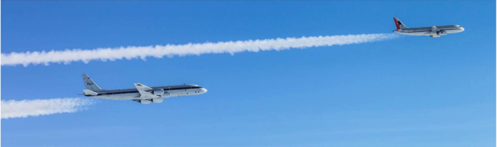 | ▲ 2018년 1월 24일 독일 상공에서 지속 가능한 항공 연료 혼합물을 사용하는 A320 항공기의 비행운을 쫓는 DC8 항공기의 모습을 담은 사진. (출처:Published: 17 June 2021 / Cleaner burning aviation fuels can reduce contrail cloudiness / communications Earth & Environment) |
