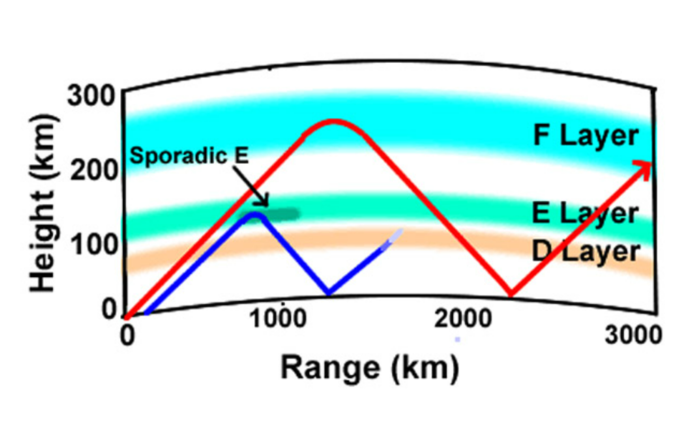 금속 이온 간섭층하지만 전리층에서 무선 통신에 영향을 미치는 교란이 때때로 발생한다. 이러한 교란 중 하나는 산발성 E층이다. 이 전리층 층은 전파 반사를 담당하는 F층 아래에 위치하며, 일반적으로 신호가 방해받지 않고 통과할 수 있도록 한다. 그러나 지구 상공 90~120km에 위치한 E층의 금속 이온 밀도가 비정상적으로 급격히 증가하는 경우가 있다.