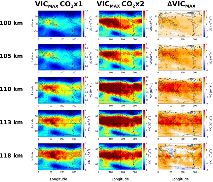 | ▲ 2001년 북반구 여름의 계절별 평균 일일 VICMAX의 전 세계 분포를 보여준다. 정상 CO2 수준(왼쪽 열), 두 배 CO2 수준(가운데 열)에서의 분포와 그 차이(오른쪽 열)를 보여준다. (출처: How Does Increasing CO2 Concentration Affect the Ionospheric Sporadic-E Formation? / Geophysical Research Letters . AGU) |