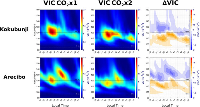 더 강하고 더 오래 지속되는 교란실제로 류(Liu)는 "연구 결과에 따르면 산발적 E층은 이산화탄소 농도가 높을수록 더 강해지고, 밤까지 더 오래 지속되며, 저위도에서도 더 자주 발생한다"고 보고했다. 시뮬레이션에 따르면, 고도 100~120km에서 중성 원자의 비율은 이산화탄소 농도가 높을수록 감소하는 반면, 전단풍(혹은 급변풍 急變風 shear wind:대기의 고도가 높아지면서 속도나 방향이 갑자기 급변하는 바람)은 변한다. 결과적으로 이 전리층에 더 많은 금속 이온이 축적되고, 산발적 E층은 더 자주 발생하고 더욱 두드러진다.