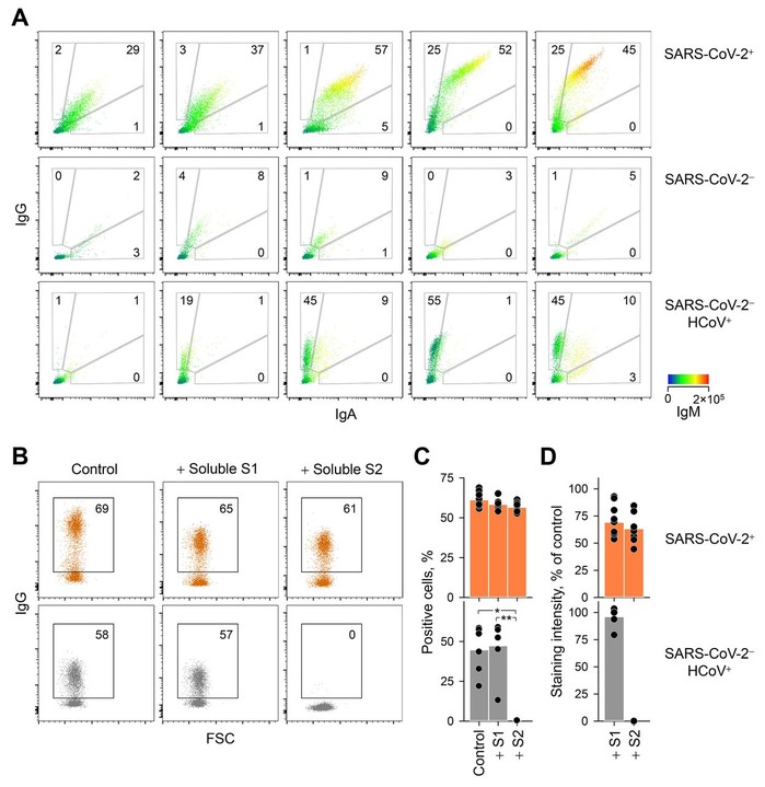 SARS-CoV-2 S와 반응하는 항체의 유세포 분석 검출 및 특이성. (A) 표시된 각 그룹에서 5명의 개체에서 IgG, IgA 및 IgM 검출. IgM 수준은 히트 맵으로 표시. (B에서 D) SARS-CoV-2- 감염된 (SARS-CoV-2 +, n = 10) 또는 SARS-CoV-2- 미 감염된 (SARS-CoV-2) 혈청의 SARS-CoV-2 S 결합 억제 − HCoV +, n = 6) 가용성 S1 또는 S2에 의한 환자. 그룹당 한 명의 대표적인 환자의 유세포 분석 프로파일이 표시 (B). 양성 세포의 평균 빈도 (C). * P = 0.015; ** P = 0.006, 순위에 대한 일원 분산 분석 (ANOVA). 평균 염색 강도 (음성 대조군 MFI의 백분율로서 샘플의 평균 형광 강도 (MFI)) (D). C와 D에서 점은 세 가지 유사한 실험 중 하나의 개별 샘플을 나타낸다. (출처:관련 논문) |