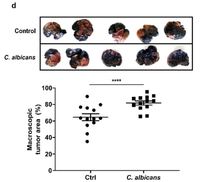 결과적으로 14일 후, 칸디다균에 의해 활성화된 암세포는 정상 세포와 비교해 생쥐의 간에서 훨씬 더 크고 많은 전이 병변을 유발했다. 이는 효모 칸디다 알비칸스가 흑색종을 악화시킬 수 있음을 확인시켜 준다. 칸디다균은 피부암을 더욱 공격적이고 이동성이 강하게 만들어 전이 병변의 형성과 성장을 촉진한다.