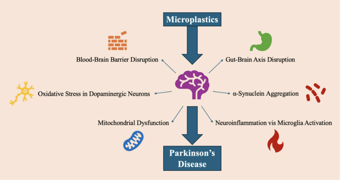 미세 플라스틱은 뇌에 침투하면 다섯 가지 방식으로 손상을 일으킬 수 있다. 연구에 따르면, 플라스틱 입자는 혈액-뇌 장벽을 통과하여 보호 장벽에 틈을 만든다. 뇌에 침투한 미세 플라스틱은 미토콘드리아 기능을 교란하고 만성 염증을 유발하며 세포에 산화 스트레스를 유발하고 뇌세포를 물리적으로 손상시킬 수도 있다. 이 모든 것이 결국 알츠하이머병이나 파킨슨병과 같은 질병의 원인이 될 수 있다.