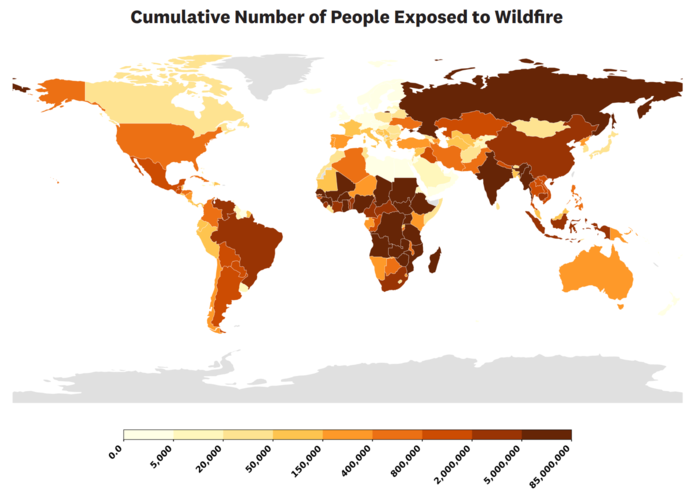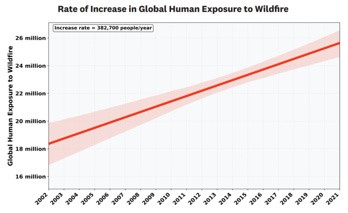| ▲ 그림 4. 전 세계 산불 노출 현황. 위쪽 지도는 2002년부터 2021년까지 각 국가별 누적 산불 노출량을 보여주고, 아래쪽 그래프는 전 세계적으로 산불에 노출되는 사람들의 수가 지속적으로 증가하는 추세를 보여준다. 이러한 증가는 주로 다음과 같은 인간 활동의 영향 때문이다.