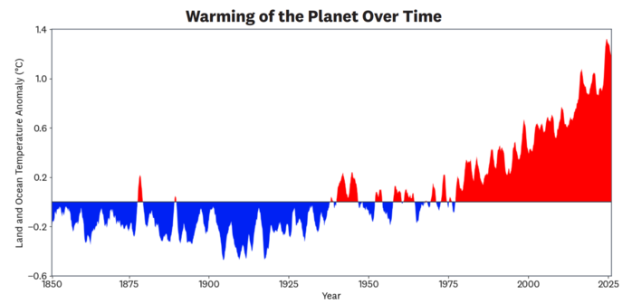 | ▲ 그림 3. 전 세계 육지 및 해양 온도 이상치. 이 차트는 1901-2000년 평균과 비교하여 시간이 지남에 따라 전 세계 온도가 어떻게 상승했는지 보여준다. 이 차트는 미국 해양대기청(NOAA) 국립환경정보센터(NCEI)의 "기후 한눈에 보기: 전 세계 시계열" 자료를 사용하여 작성되었다. |