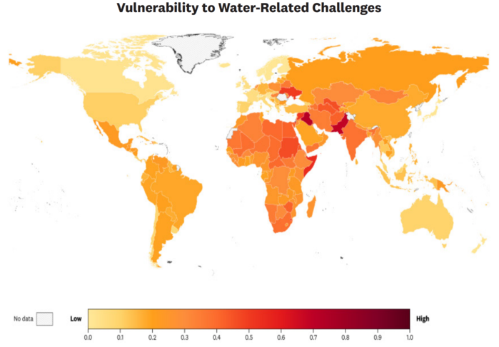 | ▲ 그림 1. 여러 국가의 물 관련 문제에 대한 기본 취약성. 이 지수는 환경적, 사회적, 경제적 조건을 고려하여 해당 지역이 물 관련 문제에 얼마나 취약한지를 반영한다. 이 지도는 수자원 취약성 모니터(Water Resources Vulnerability Monitor)의 데이터를 기반으로 제작되었다. |