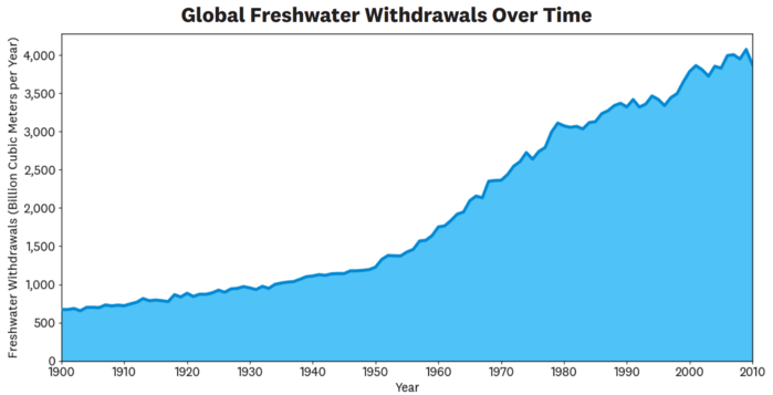 | ▲ 그림 14. 시간에 따른 전 세계 담수 총 사용량. 이 차트는 1900년부터 2010년까지 전 세계적으로 농업, 산업 및 가정용으로 사용되는 총 담수 사용량이 크게 증가했음을 보여준다. 물 사용량 증가는 일반적으로 환경의 물 사용 가능 면적 감소와 관련이 있으며, 자연 자본에 심각하고 종종 돌이킬 수 없는 피해를 초래한다. 이 차트는 Our World in Data의 데이터를 사용하여 작성되었다. |