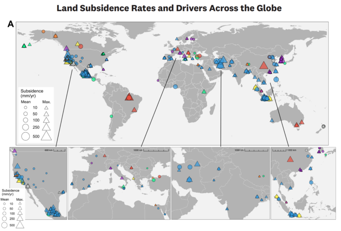 | ▲ 그림 6. 전 세계 지반 침하율 및 원인. (A) 주요 지반 침하 원인(색상)의 전 세계 지도와 평균(원) 및 최대(삼각형) 침하율(도형 크기). (B) 각 위치별 지반 침하율의 주요 원인. 이미지 출처: Huning et al. (2024),