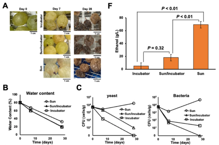배양기에서 건조시킨 포도와 혼합 건조 과정을 거친 포도를 물에 담갔을 때, 일부 포도만 알코올성 와인으로 발효되었다. 연구진은 햇볕에 말린 포도로 만든 건포도 와인에서 다른 건포도로 만든 와인보다 사카로미세스(Saccharomyces), 스키조사카로미세스(Schizosaccharomyces), 지고사카로미세스(Zygosaccharomyces)와 같은 알코올성 효모 종이 더 자주 발견된다는 사실을 확인했다.