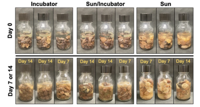 이렇게 얻은 건포도를 병에 담아 물에 담근 후 실온(15, 20, 25, 30, 또는 37도)에서 2주 동안 보관했다. 발효 후, 직접 만든 건포도 와인의 당분과 알코올 함량을 측정하고 존재하는 효모의 종류를 분석했다.
