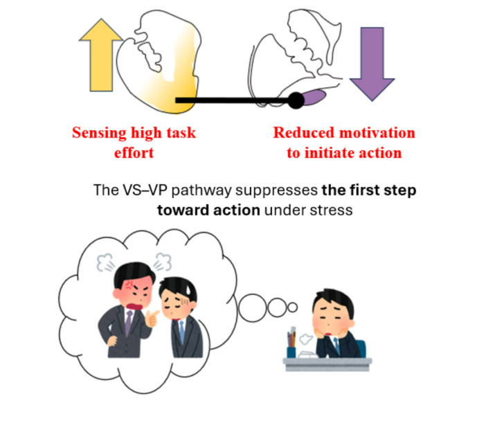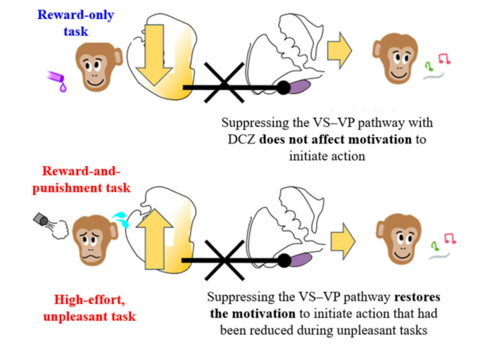 | ▲ 선조체-담핵 회로(VS-VP)는 잠재적으로 불쾌한 과제에 대한 동기 부여를 억제하는 역할을 한다. 즉, 과제를 시작하지 못하게 막는다.