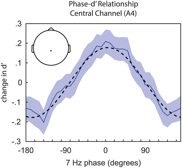▲ 위상-행동 분석 예시. 정규화된 행동 측정값은 진행 중인 EEG 진동의 자극 전 위상에 대한 함수로 표시된다. 이 예시는 7Hz 위상과 d′(파란색 실선) 사이의 관계를 보여준다. 적합된 1주기 사인파(점선)의 진폭은 위상-행동 관계의 강도. (출처:Frequency-specific attentional mechanisms phasically modulate the influence of distractors on task performance / February 23, 2026 / PLOS Biology)