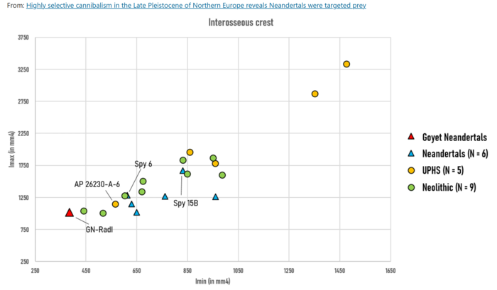 외래종 유래, 미약한 체형두 번째 발견: 동위원소 분석 결과, 식인 희생자들은 해당 지역 출신이 아니라 외래종 출신임을 확인했다. 연구진은 "고예트(Goyet)의 네안데르탈인은 외래종 식인 풍습을 시사한다"고 보고했다. 이는 다른 집단의 구성원을 살해하고 잡아먹는 식인 풍습을 설명한다. 살해된 여성들은 같은 지역 출신이었지만 서로 친척 관계는 아니었다.
