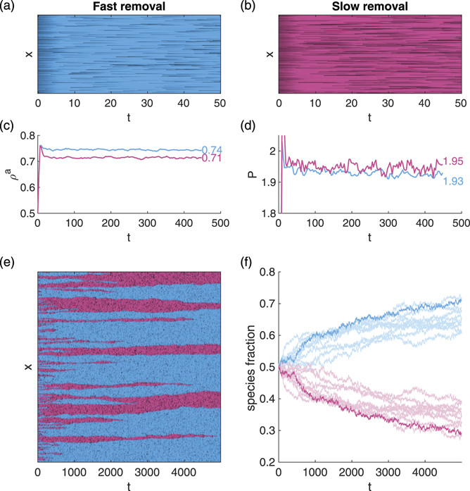 | ▲ 그림 2. 균질한 세포 샘플 및 세포 혼합물에서의 경쟁에 대한 대표적인 수치 결과(보충 비디오 1 및 2(https://stacks.iop.org/NJP/24/073003/mmedia)). 5000으로 표시된 가장 긴 시뮬레이션 시간은 ~72세대에 해당 (a) 및 (b) 균질한 샘플의 살아있는 세포에 대한 거친 kymograph. 패널(a)에 표시된 시스템을 구성하는 H 세포(파란색)는 패널(b)의 시스템을 구성하는 L 세포(마젠타색)에 비해 사망 후 더 빨리 분해된다. (c) 패널 (a) 및 (b)의 균질 시스템에 대한 성장하는 세포 밀도(활성 밀도)의 시계열(각각 10회 이상 평균). (d) 동일한 두 시스템에 대한 압력의 시계열(다시 10회 실현 이상 평균). (e) 동일한 비율로 시작하는 두 종의 혼합물에서 살아있는 세포에 대한 Kymograph(부피의 하위 집합은 단일 실현에서 표시됨). L 종의 공간 패치는 확률론적 멸종에 더 취약한다. (f) 동일한 설정 및 매개변수의 10개 구현에 대한 혼합물의 모집단 비율의 시계열. 굵은 선은 패널(e)에 묘사된 특정 실현에 해당. 종 H는 지속적으로 더 잘 수행하고 표본에서 그 비율이 증가한다. (출처: 관련논문 A competitive advantage through fast dead matter elimination in confined cellular aggregates / New Journal of Physics) |
