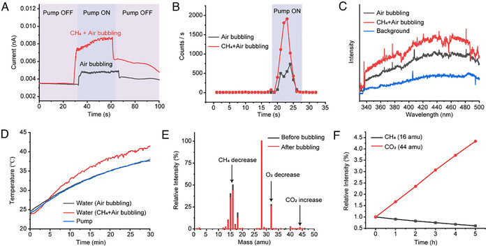 ▲ 버블링 중 광학, 열 및 제품 측정. (A) 공기 및 메탄-공기 버블링 중 실시간 포토다이오드 전류 기록. (B) 동일 조건에서 획득한 보정된 광자 계수 추적(초당 횟수). (C) 배경, 공기 및 메탄-공기 버블링 하에서 수집한 방출 스펙트럼. (D) 버블링 중 벌크 물과 펌프의 동시 온도 모니터링. (E) 버블링 전후에 기록된 헤드스페이스 질량 분석 신호(상대 강도). (F) 선택된 채널에 대한 정규화된 질량 분석 신호의 시간 변화. (출처:Unveiling ignis fatuus: Microlightning between microbubbles / September 29, 2025 / PNAS) |