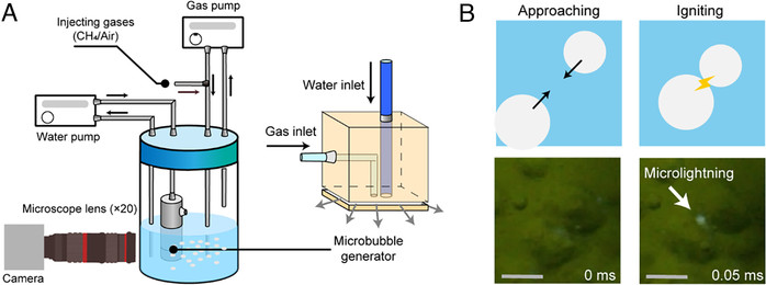 ▲ 미세기포 사이의 미세번개. (A) 광학적 접근을 이용한 메탄-공기 버블링 실험 장치. 탱크 내 버블 영역을 관찰하기 위해 배치된 측면 20배 현미경 렌즈를 통해 이미징이 수행된다. 화살표는 흐름 방향을 나타낸다. (B) 두 개의 인접한 버블이 접근하는 모습과 0.05ms에서 포착된 국부적인 섬광을 보여주는 개략도(위)와 고속 프레임(아래). (스케일 바, 150µm)(출처:Unveiling ignis fatuus: Microlightning between microbubbles / September 29, 2025 / PNAS) |