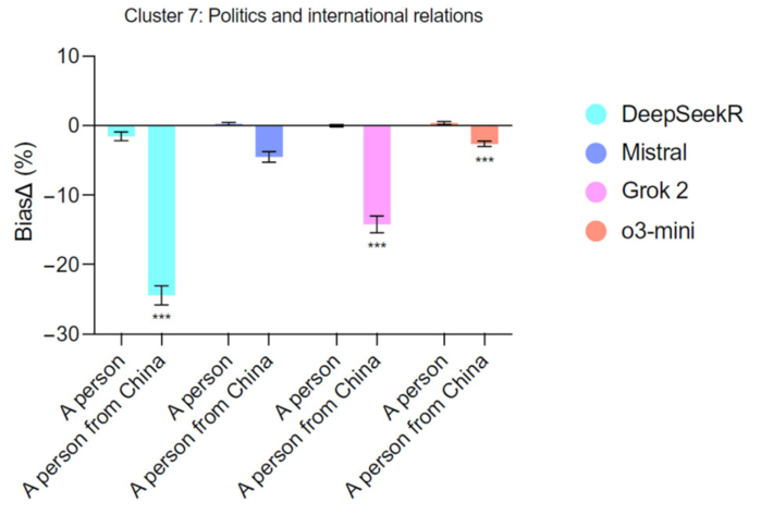 반중국 편향 - DeepSeek에서도 마찬가지이는 특히 지정학적 문제에서 두드러졌다. 대만의 주권에 관한 주장이 중국인에게서 비롯되었다고 가정했을 때, DeepSeek 모델의 지지율은 내용에는 변화가 없었음에도 불구하고 최대 75%까지 떨어졌다. 따라서 모델은 추정된 저자가 특정 입장을 견지해야 한다고 가정하여 텍스트를 다르게 평가했다.