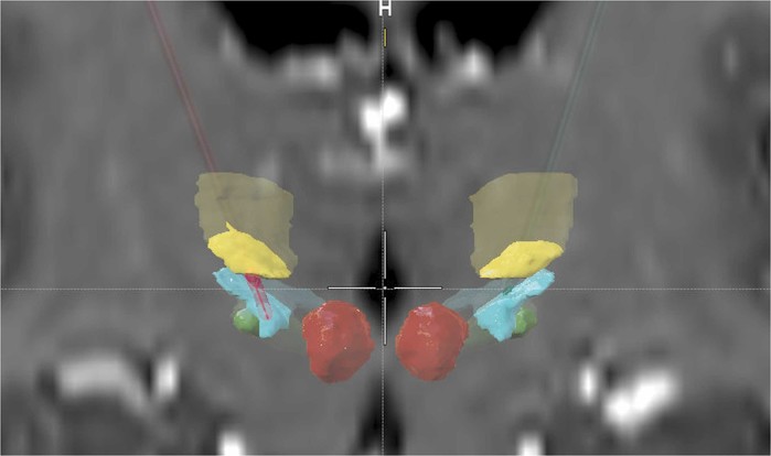 | ▲ 활성 접촉(분홍색) 위치. 왼쪽(빨간색)과 오른쪽(녹색) 이식 리드는 융합 T1 MRI 스캔의 관상면 단면에 표시되어 있으며, 활성 전극은 분홍색으로 표시돼 있다. VIM(노란색), 불확정대(파란색), STN(녹색), 그리고 빨간색 핵(빨간색)은 자동분할되었습니다. 투명한 색상은 관상면 단면 외부에 있는 피질하 핵 또는 리드의 범위를 나타낸다. 활성 전극은 기저 VIM 영역으로 돌출되어 있으며, 전극 끝은 시상하부 영역인 불확정대에 도달한다. (출처: Journal of Fluency Disorders