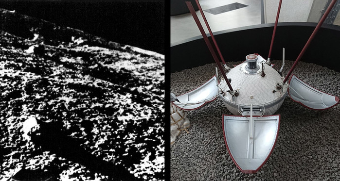 | ▲ 소련의 달 탐사선 루나 9호(오른쪽)는 1966년 최초로 유인 착륙에 성공했으며, 이 사진을 지구로 전송했습니다. 그런데 루나 9호는 정확히 어디에 착륙했을까? © historical; Stanislav Kozlovskiy, CC-by-sa 4.0 |