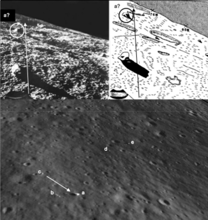 | ▲ 루나 9호가 촬영한 달 표면 사진에서 밝게 보이는 부분은 착륙 전에 분리된 주 엔진일 가능성이 있다. © Pinault et al./ npj Space Exploration, CC-by-nc-nd |