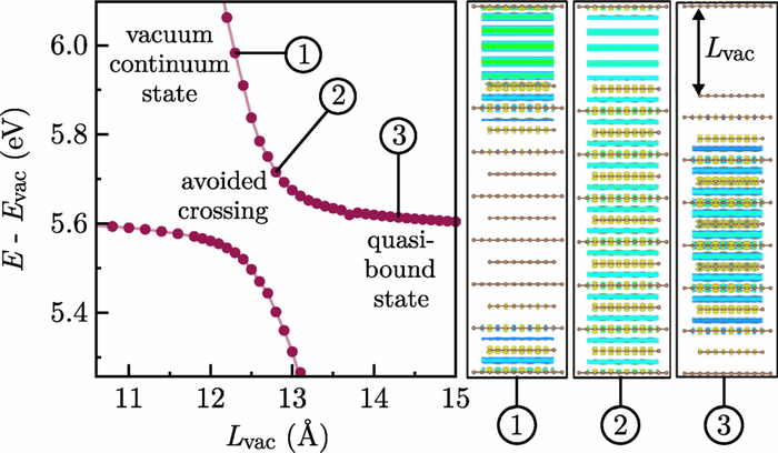 | ▲ 회피 교차를 겪는 HOPG(빨간색 점)의 준구속 상태와 이산화된 진공 연속체 상태의 파동 함수. 오른쪽 프레임 ①~③에는 회피 교차에 해당하는 14개 층으로 구성된 HOPG 슬래브에 대한 세 가지 예시 파동 함수가 왼쪽 패널에 ①~③으로 표시된 ????vac의 함수로 표시되어 있다. 색상은 전하 밀도가 증가하는 등가곡면(파란색에서 노란색으로)을 나타낸다. 소프트웨어 vesta [29]를 사용하여 렌더링했다. (출처:Identifying Electronic Doorway States in Secondary Electron Emission from Layered Materials / Published 15 October, 2025) |