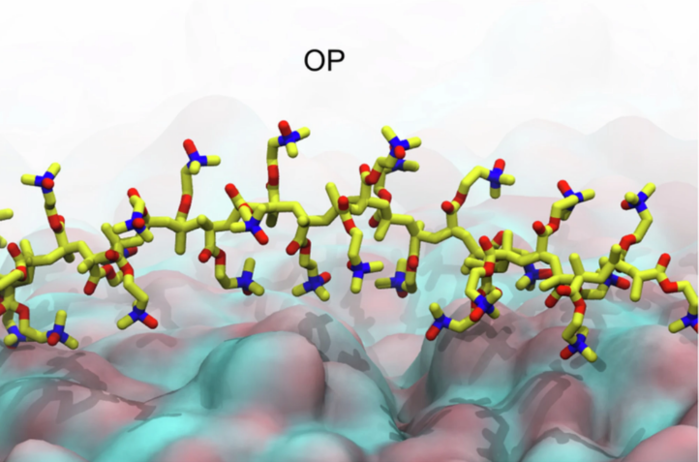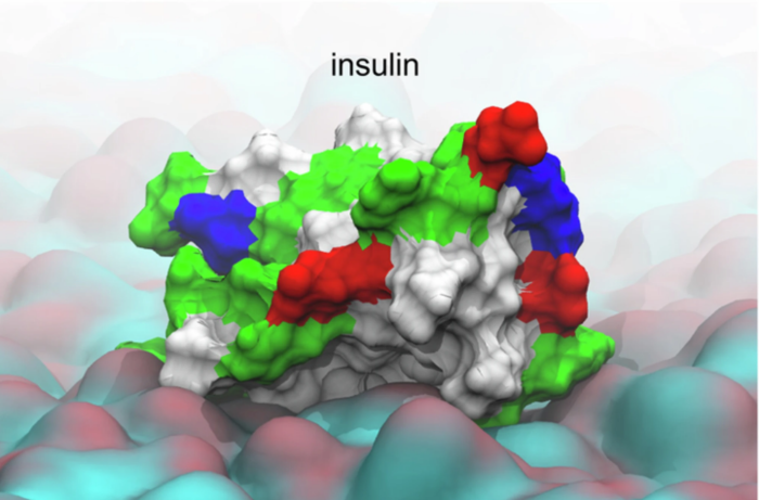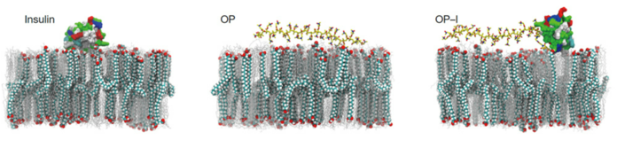 | ▲ b, pH 5.5에서 거친 모델 SC 지질 표면에서의 인슐린과 OP의 대표적인 국소 결합 모드. (출처: Published: 19 November 2025 /