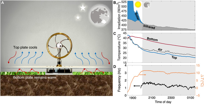 ▲ 야간 복사 냉각 엔진 작동. (A) 야간 엔진 작동 개략도. 상부 플레이트는 밤하늘과 복사적으로 결합되어 주변 기온보다 낮게 냉각된다. 하부 플레이트는 지면과 열적으로 결합되어 밤하늘로의 복사 접근이 알루미늄 상부 플레이트에 의해 차단되므로 더 따뜻하게 유지된다. 이러한 복사 불균형이 엔진을 구동하는 온도차를 생성한다. (B) 2023년 8월 14일 저녁부터 밤까지 하늘에서 발생하는 하강풍 적외선 복사와 태양 복사량을 그래프로 나타냈다. 이러한 출력 플럭스는 방출 상부 플레이트의 온도를 제어한다. 하강풍 적외선의 변동은 수분 함량이 높아 적외선을 강하게 방출하는 구름이 지나가면서 발생한다. (C) 작동 중 주변 공기와 비교한 엔진 플레이트의 온도. 상부 플레이트와 기온의 변동은 하강풍 적외선의 변동과 일치한다. 하강풍 출력이 감소함에 따라 평균 온도가 감소한다. (D) 엔진 주파수와 온도차는 거의 일정하게 유지된다. 하향적외선의 일시적인 증가로 인해 엔진의 온도 차이가 줄어들면 물리적으로 엔진 속도가 느려진다. (출처: Mechanical power generation using Earth’s ambient radiation / Science Advances / 12. Nov 2025)
