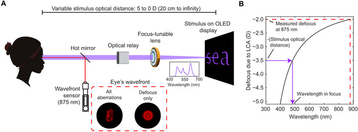친(Chin) 연구팀은 일련의 실험을 통해 이 이론을 검증했다. 정상 시력을 가진 8명의 피험자에게 다양한 색상과 거리의 글자를 보여주고, 적외선 레이저를 이용해 눈의 초점 조절 방식을 감지했다. 연구팀은 "센서가 눈에 적외선을 쏘고 반사된 파면의 왜곡을 측정한다"고 설명했다. 이를 통해 눈이 초점을 맞출 때 어떤 파장을 우선시하는지 알아낼 수 있었다.