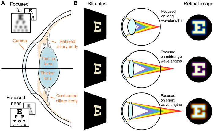 색이 있는 물체를 선명하게 보기 위해 우리 눈은 절충안을 사용한다. 수정체가 모든 파장의 빛에 동일하게 초점을 맞출 수는 없기 때문이다. 최근 한 실험을 통해 눈이 색수차 문제를 어떻게 해결하는지 밝혀졌다. 기존의 가정과는 달리, 중간 파장이 결정적인 요소가 아니다. 연구진은 "Science Advances"에 발표한 논문에서 우리 눈이 보색의 대비를 초점 조절에 활용한다고 밝혔다.