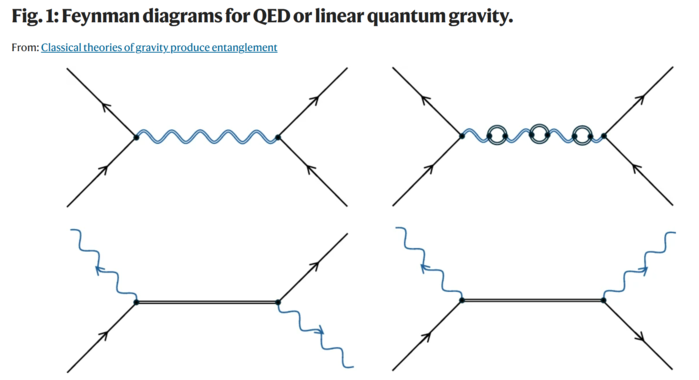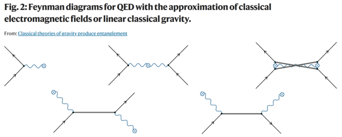 | ▲ 구불구불한 파란색 선은 고전적인 전자기장 또는 중력장 또는 퍼텐셜을 나타낸다. 십자 표시는 이러한 장 또는 퍼텐셜의 고전적 원천을 나타낸다. 그림 1과 같이 검은색 선은 전자, 양전자, 또는 일반적인 물질 또는 반물질 입자를 나타낸다. 시각화의 편의를 위해 화살표가 없는 이중선은 가상 입자를 나타낸다.  (출처: Published: 22 October 2025 / Classical theories of gravity produce entanglement / nature) |