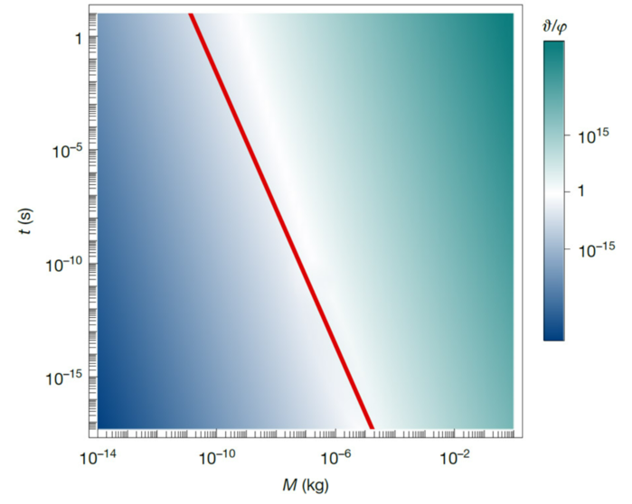 | ▲ 실험에서 진정한 양자 얽힘은 빨간색 선 왼쪽에 있는 질량 및 결맞음 시간에서 분명하게 나타나야 한다. 그러나 순수한 고전적 얽힘 효과는 빨간색 선 오른쪽에서도 발생할 수 있다. © Aziz and Howl/Nature, CC-by 4.0 |