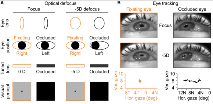 | ▲ (A) 위에서 아래로 수정체, 눈의 위치, 전기적으로 조절된 렌즈, 그리고 열린 고정안(주황색)과 가려진 눈(검은색)을 통한 지각을 보여주는 만화 그림. 초점이 맞춰졌을 때 수정체는 이완된 상태다. 고정안이 -5디옵터(-5D)의 초점 이탈을 인지하면 수정체의 굴절력이 증가하고 가려진 눈은 마치 물체가 관찰자에게 다가오는 것처럼 코쪽으로 이동한다.