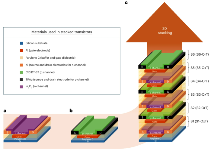 특히, 이 적층 마이크로칩은 두 가지 서로 다른 트랜지스터 변형 층이 교대로 배열된 구조다. 첫 번째는 알루미늄으로 만들어진 소스 전극과 n형 도핑된 금속 산화물 반도체인 인듐 산화물로 만들어진 채널을 사용한다. 이는 이러한 반도체에 불순물이 채워져 과잉 전자를 생성한다는 것을 의미한다. 두 번째 트랜지스터 변형은 p-도핑되어 양전하 과잉을 갖는 유기 박막 반도체(C16IDT-BT)로 만들어진 채널을 가지고 있다.