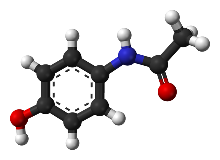 | ▲ 파라세타몰 분자(C8H9NO2)의 공-막대 모형. (https://commons.wikimedia.org/wiki/File:Paracetamol-from-xtal-3D-balls.png) |