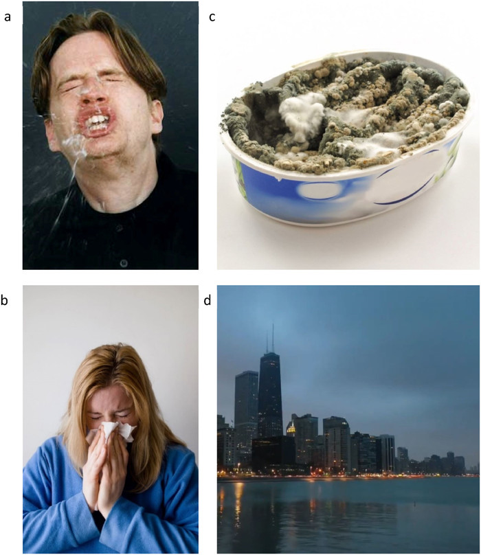 | ▲ 그림 1. 4가지 자극 세트의 예: a) 에어로졸(© Ulf Lundin); b) 은폐된 전염 초기(Mojep(pixaby.com)); c) 역겨운 음식(Haberkamp et al., 2017); d) 풍경사진(Ricardo Esquivel(pexels.com)). (출처: 관련논문 Disease-related disgust promotes antibody release in human saliva / Brain, Behavior, & Immunity - Health Volume 24, October 2022, 100489) |
