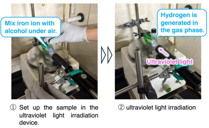 이 대조 실험에서 연구팀은 메탄올에 수산화나트륨(NaOH)과 염화제2철(FeCl₃)을 녹였다. 규슈 대학의 마츠모토 타카히로는 "이 혼합물에 자외선(UIV)을 조사하자 상당량의 수소 가스가 생성됐다"며, "처음에는 믿기 어려웠지만, 추가 실험을 통해 이 결과를 검증하고 확인했다"고 설명했다.