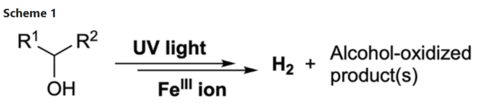| ▲ Fe 촉매를 이용한 알코올의 탈수소화 반응. 본 연구에서는 FeIII 이온을 촉매로 사용하여 자외선 조사 하에 알코올로부터 H2를 발생시켰다(R1 및 R2는 알킬기 및/또는 H를 나타냄). (출처: Published: 17 April 2026