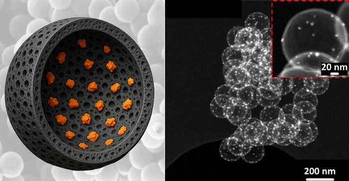 ▲ 철 입자를 포함하는 다공성 속이 빈 탄소 구체는 리튬 이온 배터리의 자원 효율성을 높이고 환경 친화성을 향상시킬 수 있다. © Borhani et al./ Chemistry of Materials, CC-by 4.0