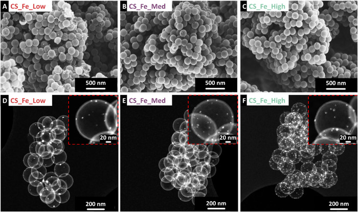 ▲ (A) CS_Fe_Low, (B) CS_Fe_Med, (C) CS_Fe_High의 주사 전자 현미경 사진. (D) CS_Fe_Low, (E) CS_Fe_Med, (F) CS_Fe_High의 주사 투과 전자 현미경 사진. (출처:January 29, 2026 / Iron-Loaded Carbon Spherogels as Sustainacations)ble Electrode Materials for High-Performance Lithium-Ion Batteries / ACS Publi)