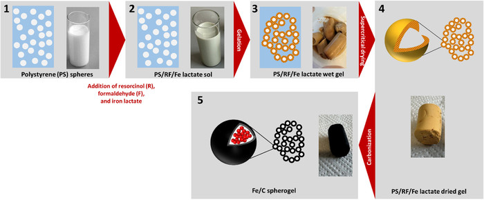 ▲ 철이 함유된 탄소 구형 겔의 합성 절차에 대한 개략도. (출처:January 29, 2026 / Iron-Loaded Carbon Spherogels as Sustainacations)ble Electrode Materials for High-Performance Lithium-Ion Batteries / ACS Publi