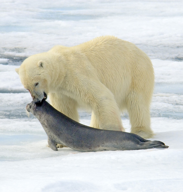 | ▲ 북극곰(Ursus maritimus)과 갓 죽은 수염물범(Erignathus barbatus) 새끼. 북극곰은 주로 먹이의 고에너지 지방을 섭취하여 지방을 축적하고, 종종 대량의 사체 생물량을 버린다. (출처:Predators and scavengers: Polar bears as marine carrion providers / 28 October 2025 / OIKOS) |