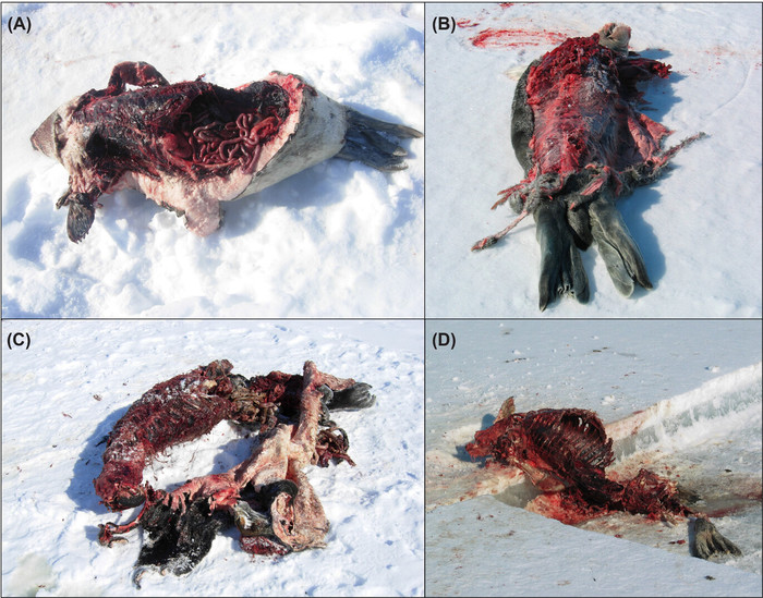 | ▲ 네 가지 다른 북극곰 Ursus maritimus 포식 사건에서 버려진 먹이 유해: (A) 성체 고리무늬물범 Pusa hispida, (B) 수염물범 Erignathus barbatus 새끼, (C) 잘 먹은 성체 수염물범, (D) 잘 먹은 성체 고리무늬물범. (출처:Predators and scavengers: Polar bears as marine carrion providers / 28 October 2025 / OIKOS) |