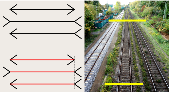 ▲ Müller-Lyer 착시와 Ponzo 착시에서는 모든 선의 길이가 동일하다.