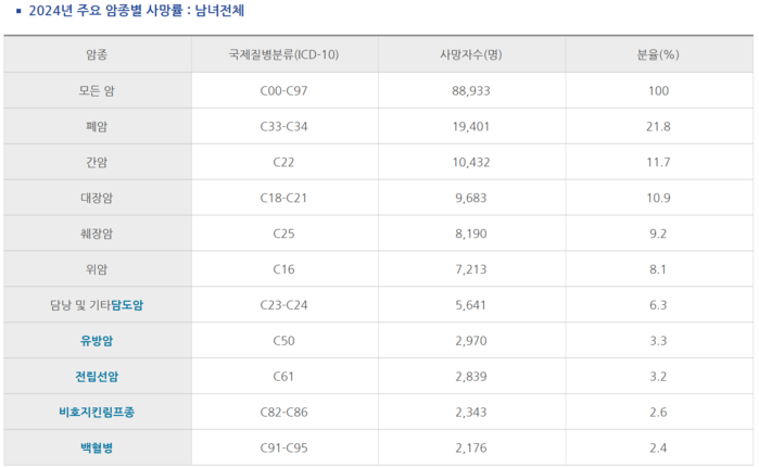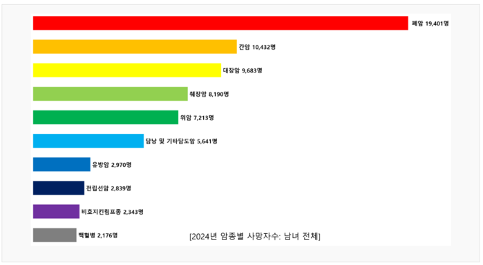 국가암지식정보센터 자료에 의하면, 2024년에 암(C00-C97)으로 사망한 사람은 총 88,933명으로 전체 사망자(358,569명)의 24.8%가 암으로 사망했다. 사망률이 가장 높은 암은 폐암(전체 암사망자의 21.8%인 19,401명)이었으며, 다음으로는 간암(11.7%), 대장암(10.9%), 췌장암(9.2%), 위암(8.1%) 순이었다.