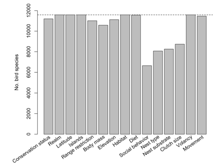 ▲ 전 세계 조류 종에 대한 형질 데이터는 전 세계 조류 형질 데이터셋인 BIRDBASE에서 제공된다. BIRDBASE에 포함된 15가지 조류 데이터 범주를 보여준다. 각 막대의 높이는 BIRDBASE가 데이터를 제공하는 종의 수를 나타내며, 최대값은 점선으로 표시된 11,589종의 조류 전체다. (출처:Published: 30 September 2025 / BIRDBASE: A Global Dataset of Avian Biogeography, Conservation, Ecology and Life History Traits / Scientific Data) |