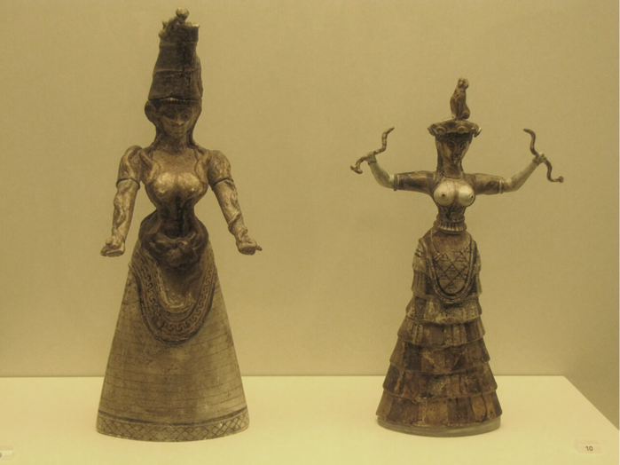 | ▲ 미노아 여신 조각상들, 오른쪽에 있는 유명한 뱀 여신상도 포함되어 있다.